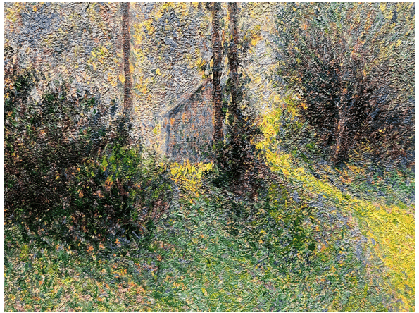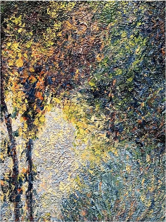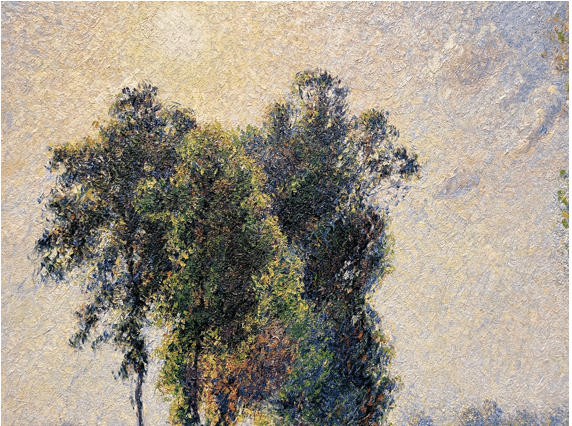 Detail of foliage in Pissarro’s “Landscape at Saint-Charles, near Gisors, Sunset” He didn’t paint the leaves – he painted the light bouncing off them.
