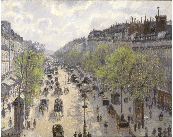 Camille Pissarro, “The Boulevard Montmartre on a Winter Morning,” oil on canvas (1897) in the Metropolitan Museum of Art, New York City. 64.8 × 81.3 cm.