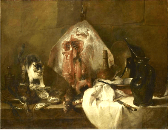 Yet, Chardin’s most famous still life is The Ray, a strictly naturalistic piece that was the young artist’s entrée to the Paris Salon. It’s a strange image – a partly cut-open skate hangs on a kitchen hook while a (presumably hungry) cat with a sort of demonic smile bristles at a dead fish.