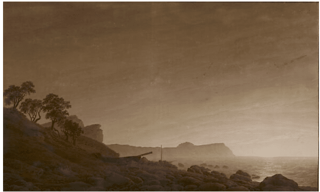 The location, Cape Arkona on the German island of Rügen in the Baltic Sea, has significance as one of the last strongholds in the region in which a temple stood for a people who practiced a form of nature spirituality. The theme of humanity’s estrangement from and longing for wholeness with nature would remain central to Friedrich’s work and all of Romanticism.