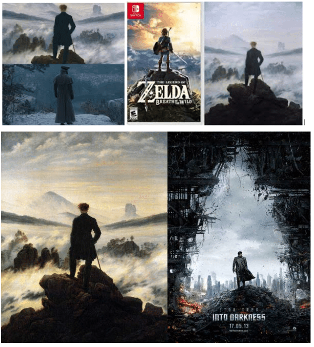 Two hundred years later and still relevant (r-l: Friedrich (1820) vs. Nosferatu 2024, Zelda the video game, & Star Trek, Into Darkness.