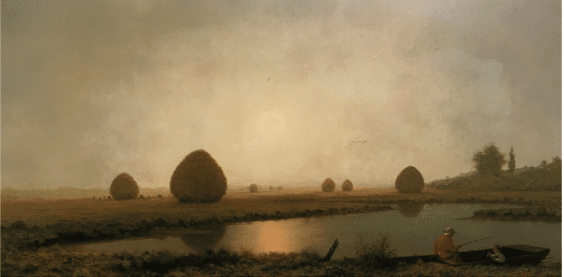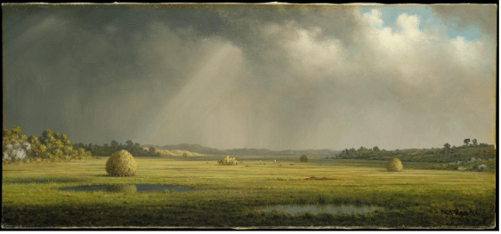 Heade’s marshes became, as the Met Museum writes, “an ideal stage for the transient weather effects that had originated in his earlier coastal storm paintings. He painted these wetlands for 45 years, focusing on haystacks, water, and sky, without extraneous details. His minutely scaled renderings of nature’s climatic cycles may be understood as intimations of his own moods.”