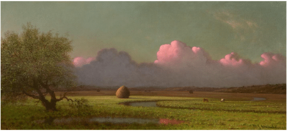 Like other painters of the time, Heade painted seascapes in this format. However, in another rebellion against the Hudson River aesthetic, these aren’t huge paintings. “Dawn,” from 1862 (above), is 12” x 24.” Taking the same format but removing the distraction of the ocean’s drama, he invited his viewers to explore atmosphere and light as expressions of internal states, feelings, and mood.