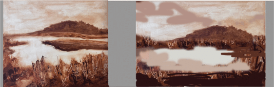 Student underpainting (left) with suggested changes made with image editing software (right). The final painting would need to have plenty of interest in the water to make this composition work.