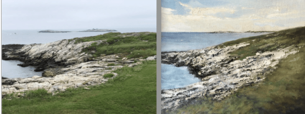 Even though the photo on the left was a decent one, the artist here made numerous changes, both obvious and subtle, to create the more dynamic (and textural!), less flat-feeling painting on the right. The editorializing largely has to do with temperature (what’s all cool in the photo gets areas of warmth in the painting) and tilting the picture plane toward the viewer – see in the grass in the lower right corner – while tilting it away in the upper right. These corner areas have also been darkened with shadows the artist has invented to discourage viewers from wandering too far away from the main event – the rocky shore at the center of the composition (an example of “the painting itself mattering more than copying what it’s a painting of.”