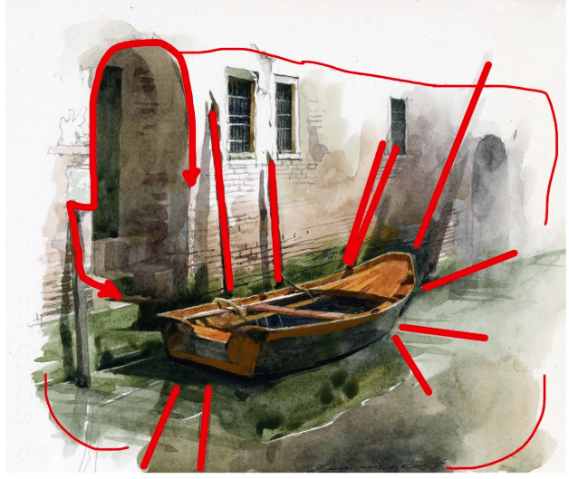 As you can see in the mark-up below, Miller’s “Venice Study” is also a study in design. The work’s composed with the main subject – the boat – at the center and everything else is designed in such a way as to support this. This design ensures the eye knows where to go – toward the boat – and where not to go (outside of the painting). EVERYTHING points us in toward the middle of the painting, riveting us to the subject. NOTHING points us toward the edges or lets us leave. It’s a masterful composition.