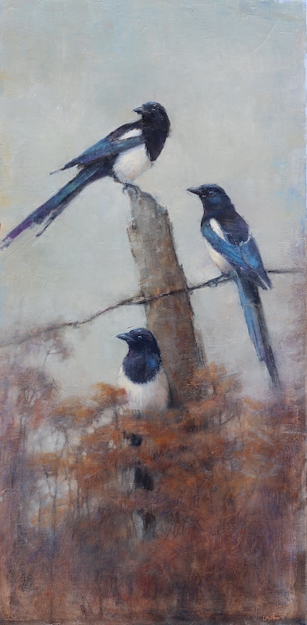 Lori McNee, Mid-Winter Magpies, 48×24, oil on canvas. Limited palette: Cad Orange, Ultramarine Blue, Permanent Green Deep, Madder Lake
