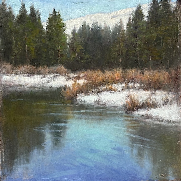 For instance, my recent painting titled “Midday Reflections” 30×30, oil on canvas was created using a double complementary palette of Cadmium Orange, Ultramarine Blue, Permanent Green Deep, Madder Lake, and Titanium White. This limited palette provided me with a great range of color and temperature to create beautiful harmonies. I was particularly surprised by the range of warm colors this palette achieved without the use of Yellow! In this case, less was more.