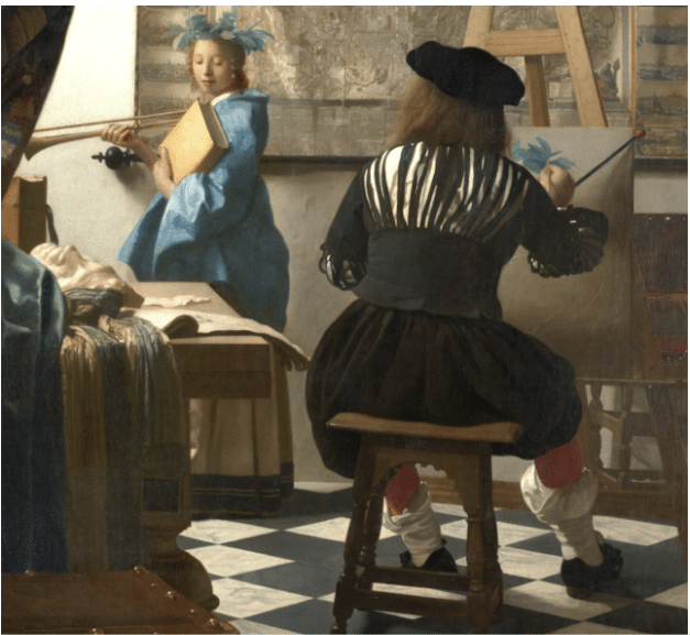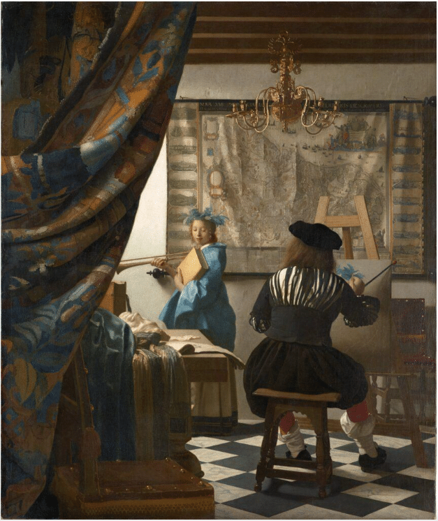 First, consider the composition and the setting. Check out the tapestry hanging along the left side of the painting. It’s been drawn aside like the curtain in a theater. This does more than beckon our attention into the work; its reference to theater and drama subtly announces that this is no randomly observed domestic setting but a carefully composed “stage,” a tableau laden with story and meaning(s). What’s more, the meaning relates to the creative arts, for this is The Art of Painting, also called The Allegory of Painting and The Painter in his Studio, and it is packed with carefully chosen evocative details.