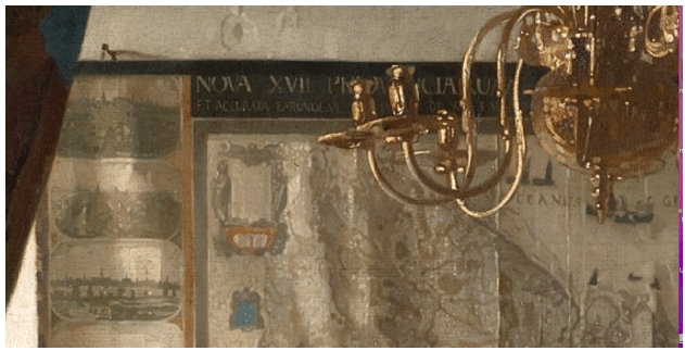 On the wall hangs a large map of the Netherlands. Art historians have noted that a crease neatly divides the Seventeen Provinces into the north and south, likely to symbolize the division between the Dutch Republic to the north and the provinces to the south that were then under Austrian Habsburg rule. This interpretation might have appealed to Hitler, who owned the painting during World War II.