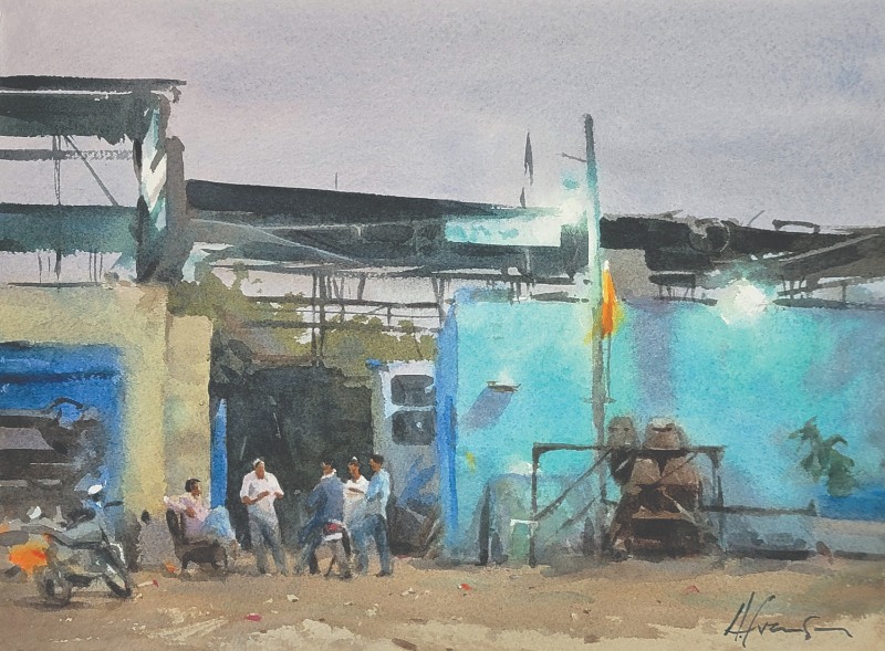 “Shop Talk” (watercolor, 11 x 15 in.) by. Andy Evansen
