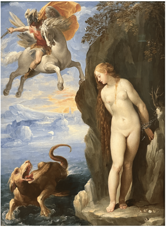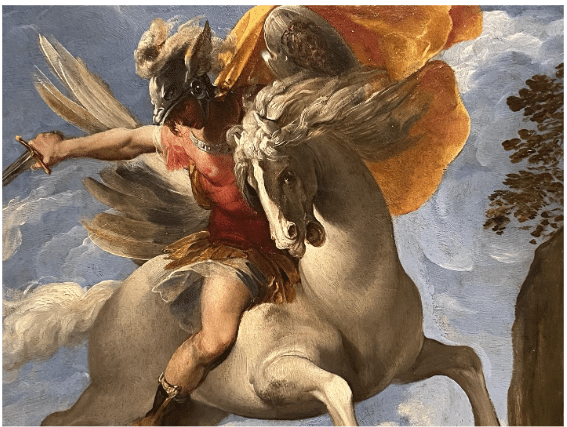 Arpino’s painting shows the Greek hero Perseus swooping down from the sky riding on Pegasus, the winged horse. Perseus is rescuing Andromeda, a princess who is chained to a rock, from being sacrificed to a sea monster by her father, a superstitious king.