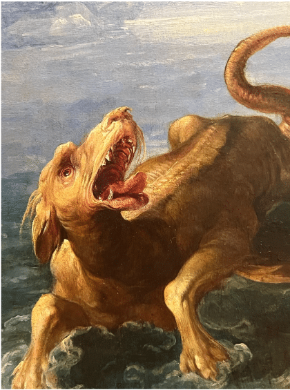 DETAIL: The sea monster (for which Cavaliere d’Arpino probably used his DOG as the model!) in “Perseus Rescuing Andromeda,” oil on panel, c.1595 (approx.. 25 x 30 in).