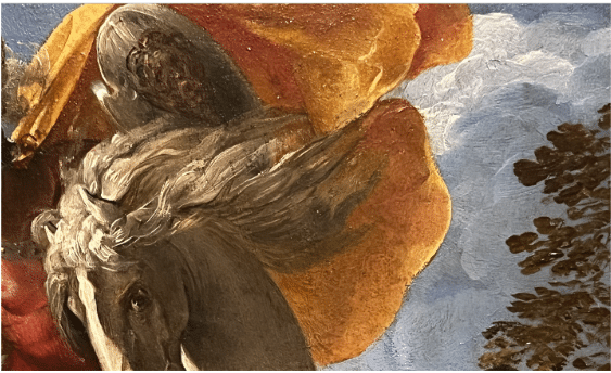 Arpino was careful to hide his brushstrokes when painting smooth surfaces, such Andromeda’s flesh. However, he let himself go and created more vigorous painterly textures when drama and movement were called for, such as in the horse’s flowing mane and tail, as well as in the cloud-swept sky.