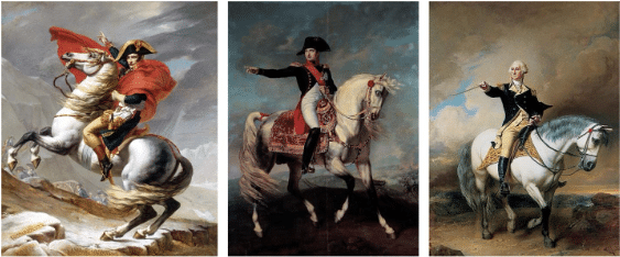 ”Napoleon Crossing the Alps” on horseback by French neoclassicist Jacques-Louis David, 1800-1801 (left), additional oils of Napoleon on horseback, 1810, (center) and of Washington Receiving a Salute on the Field at Trenton, painted by Fohn Faed in 1857 (right).