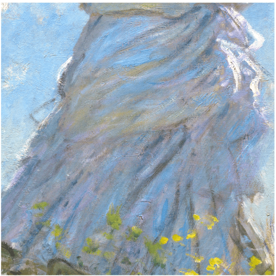 Most perfectly well-intentioned web sites and even art historians will tell you who these figures are and where they were when Monet painted them – thereby completely missing what’s interesting and wonderful about Woman with a Parasol. Let’s not do that.