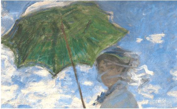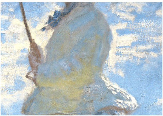 Because of the brushstrokes, the folds of the gauzy veil seem to flow into and be continued by the brushy clouds directly behind her head. Note, too, how the crowning touch – the inside of the parasol – is the same color (green/s) as the grass. The brushstrokes here suggest nature’s green life radiating down from above in answer to the grass we saw reaching up from below.