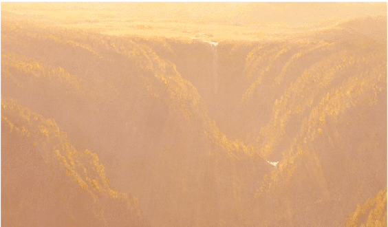 In the left foreground, a hunter and his dog climb the rocks. Barely visible in the image above, they merge with the terrain as they make their way to the platform overlooking the ravine, which is burnished by an Indian summer haze.