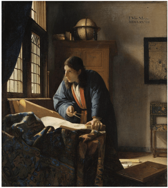 Vermeer’s painting is linked to a second one for which he’s believed to have used the same model, this time in the guise of a geographer. Paintings of scholars in their studies were not unusual for this time, when Enlightenment science and philosophy were fascinating new frontiers of human knowledge.