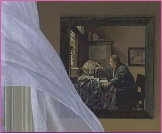 First of all, Gordon’s painting is very much in line with the Dutch interior tradition. In the painting on the wall, Vermeer’s “The Astronomer,”(above) a dreamy young man rises from his chair and lightly rests his fingertips upon a celestial globe (3D map of the heavens). Mild light filters through the window, softening his features. Behind him on the right side of the wall we find a painting of Moses (as Biblical leader and navigator) and on the left, an adjustable star map. There’s also a book on the desk, one page of which refers to divine providence. Vermeer’s subtle symbolism captures a time in history when religion and science remained in balance. It’s altogether a tender image, and like all of Vermeer’s paintings, deliberately poetic and open-ended.